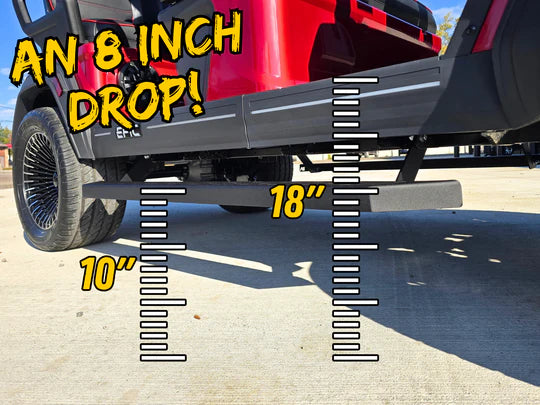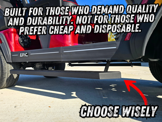 The BA Trail Steps™ for the Epic E40FX make getting in and out of your lifted cart effortless — while giving it the bold, aggressive stance it should’ve come with from the factory. These full-length, textured running board steps drop a true 8 inches below the floor, creating an actual step you can use, not a flat bar tucked against the rocker.